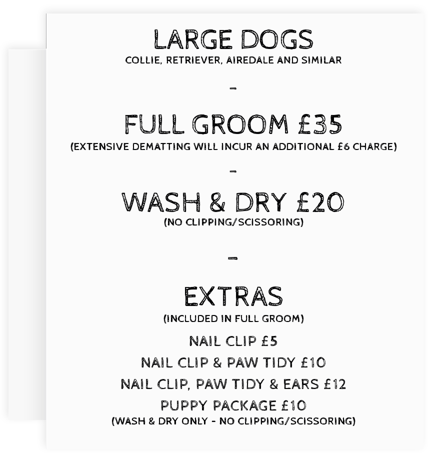 We hand dry dogs, using a profesional dryer. We don't use cage driers which can be dangerous and distressing for your dog.
